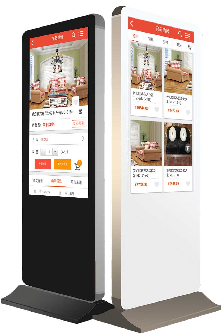 它样式新颖,搞活动时放上一排导购机,可以聚集人气,还可线上下单,实用性也很强。还可以把它放到人流量大的其它地方去,将销售的触角延伸到各处。到外地促销时可以拖一堆导购机过去,就不用带太多的实物样品了,非常方便!